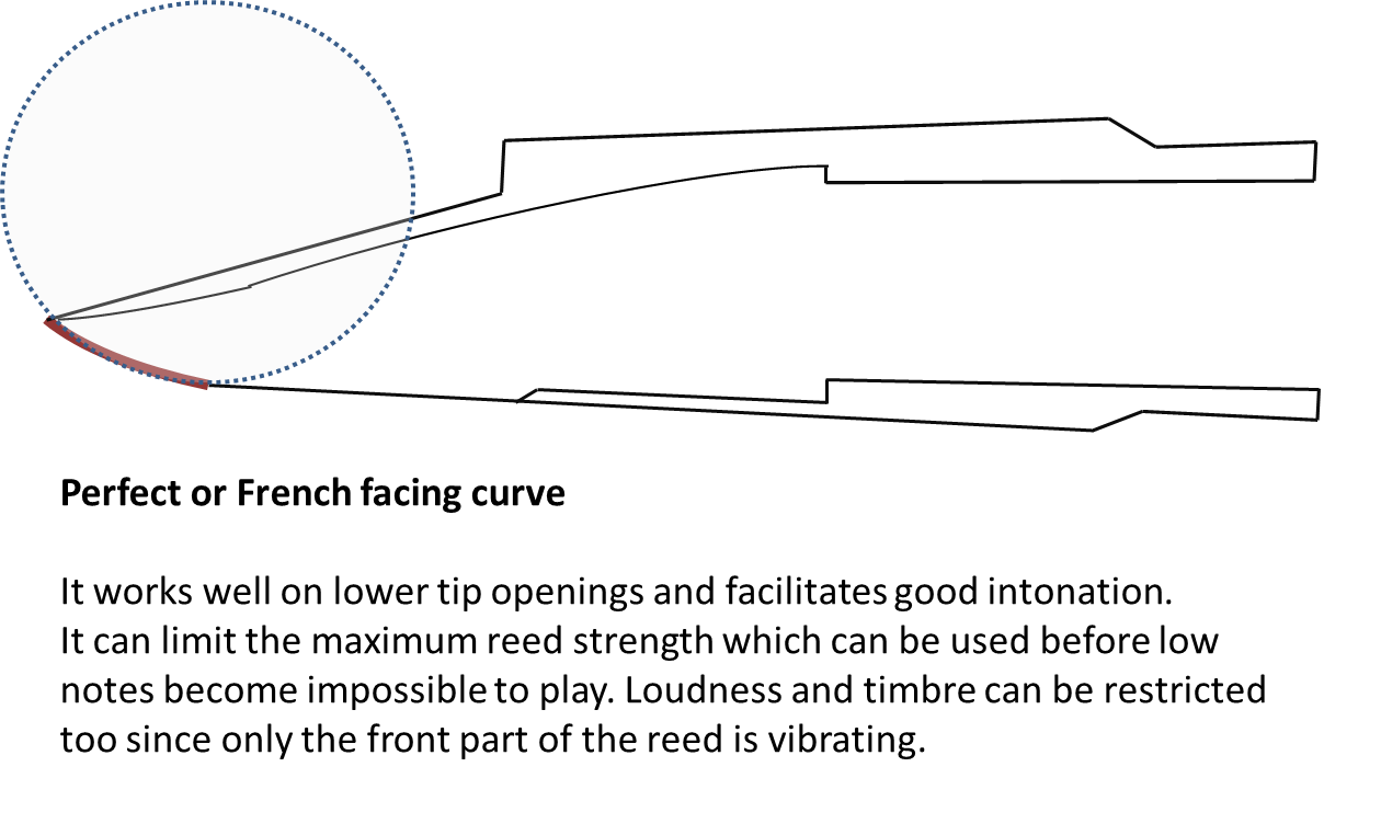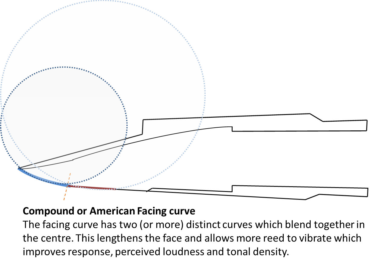 There are two broad types of facing curve; perfect curve and compound curve. French designed mouthpieces tend to use a perfect curve. American designs tend to use a compound curve.